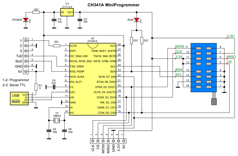 پروگرامر CH341A بر پایه تراشه اصلی CH341 ساخته شده و از طریق رابط USB 1.1 به کامپیوتر متصل میشود. این پروگرامر کوچک و قابلحمل، به دلیل قیمت اقتصادی، سهولت استفاده و سازگاری گسترده با انواع تراشههای حافظه، در میان تعمیرکاران و علاقهمندان به الکترونیک محبوبیت بالایی دارد.