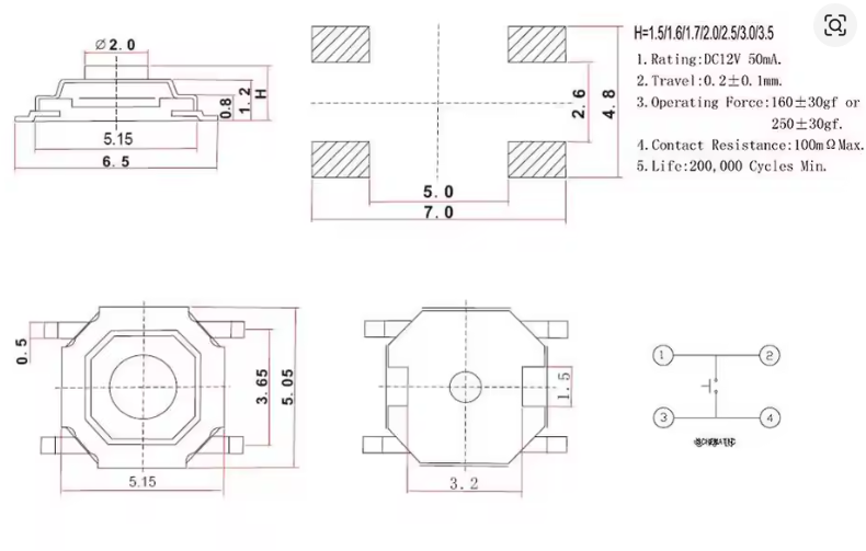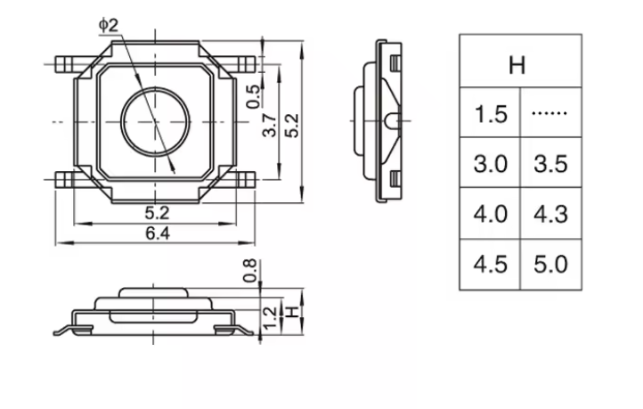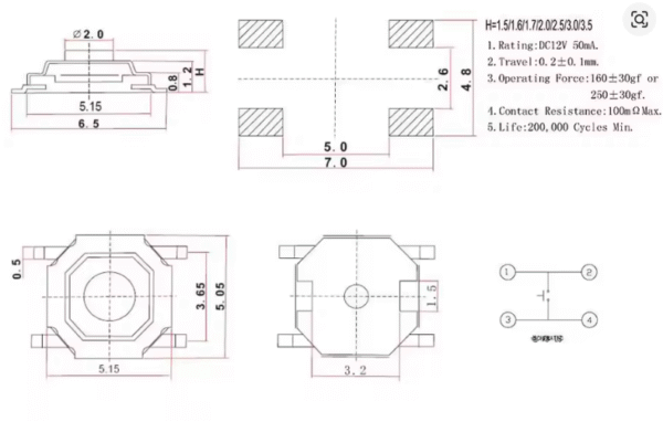 - کلید فشاری تکتایل با ابعاد جمعوجور 4×4×4.3 میلیمتر