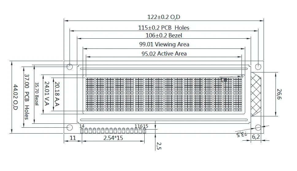 - ابعاد ناحیه نمایش: 64.5 × 13.8 میلیمتر