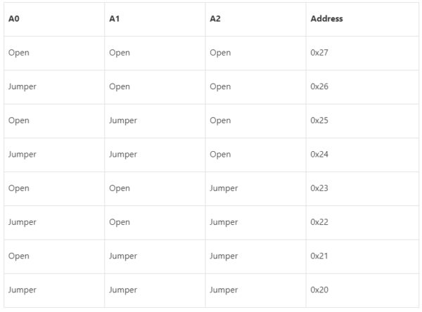 - آدرس I2C پیشفرض: 0x20 (قابل تغییر با جامپرهای A0، A1 و A2)